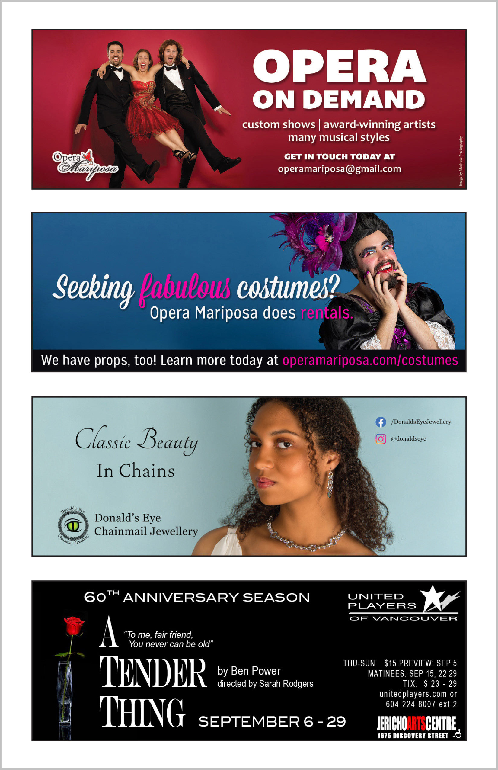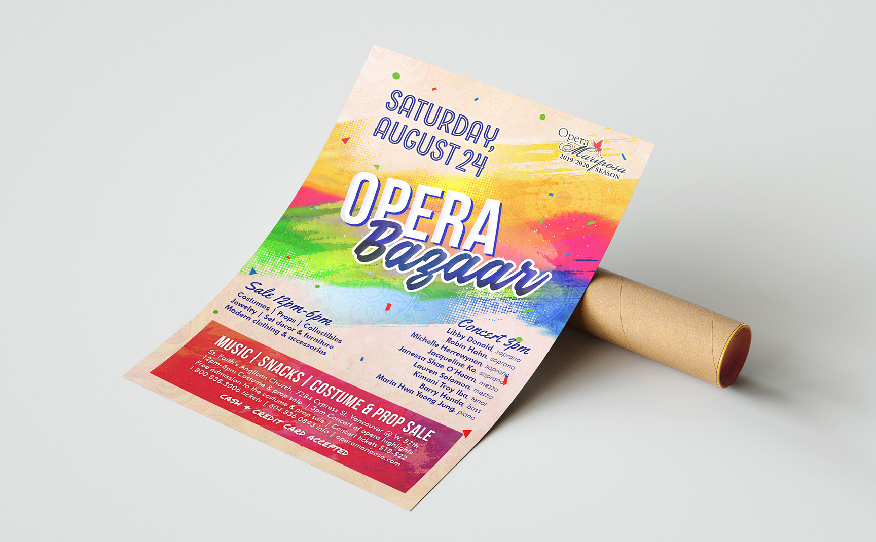 Print materials for a costume/prop sale and concert event, specifically designed for home/office printer output. Scope of work also included writing show program copy and executing some of the program ad designs.