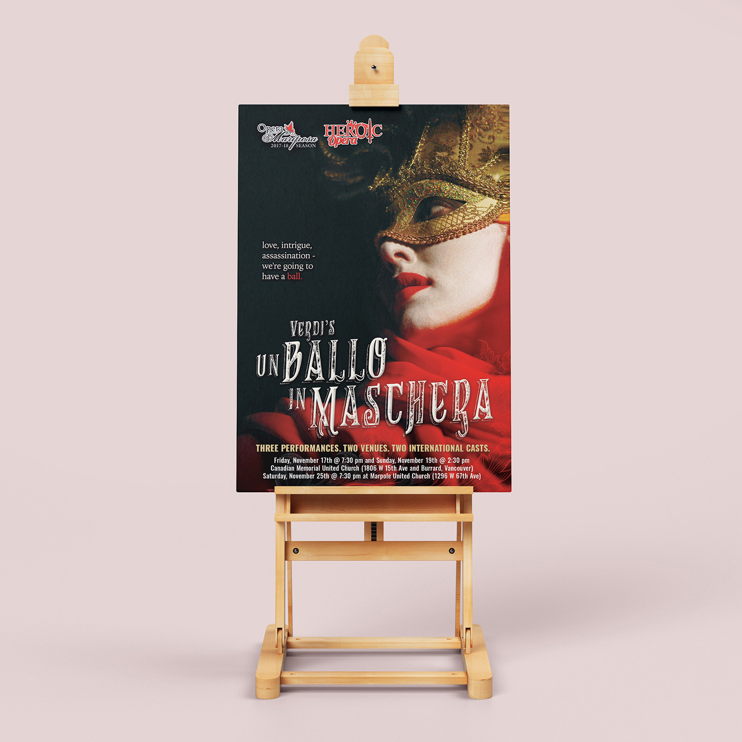 Poster and promotional materials for a production of Verdi's 'Un ballo in maschera' (A Masked Ball). The creative brief was to evoke opulence, intrigue, and classic grand opera.